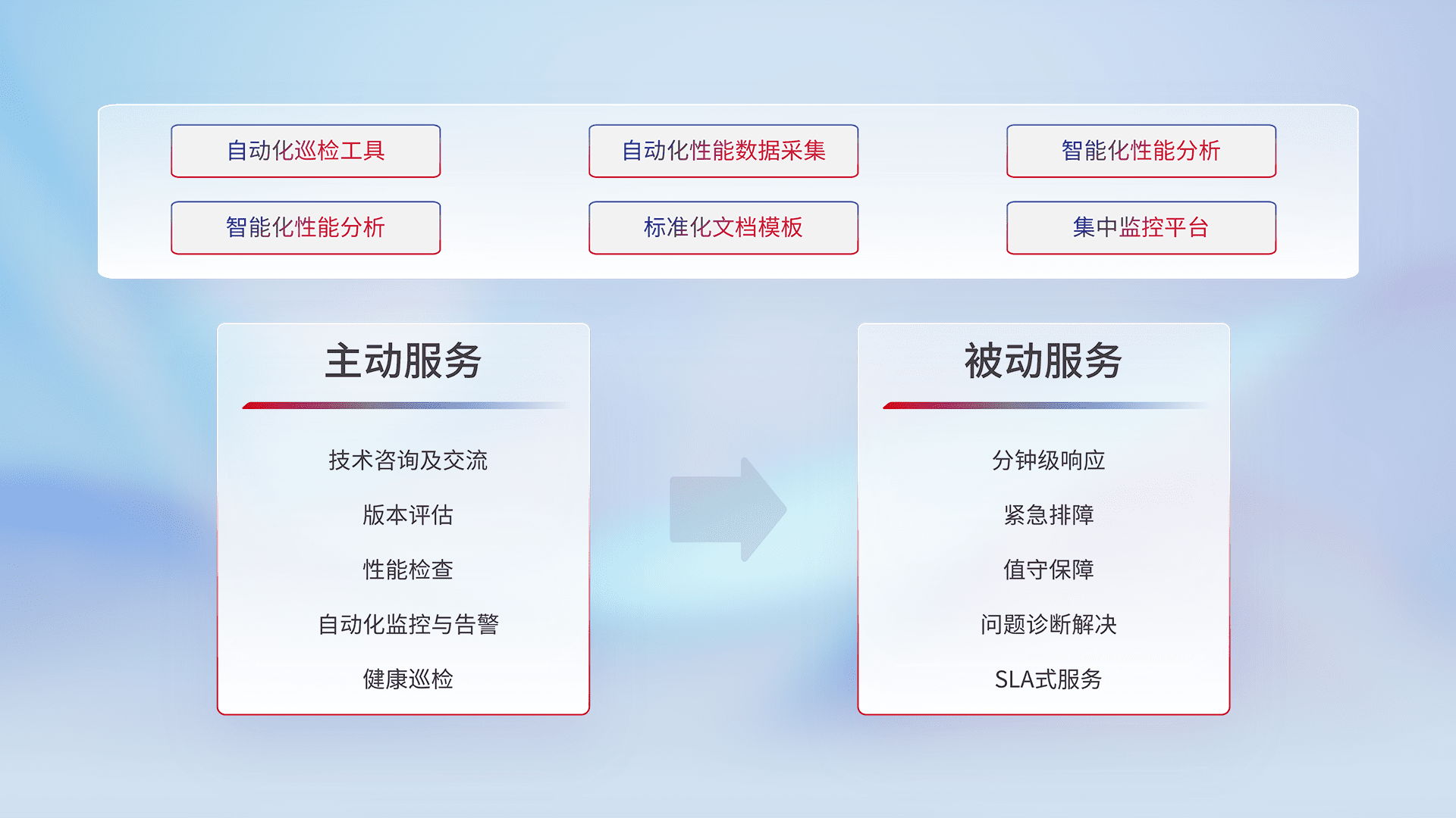 智能化工具和标准化文档,,保障服务质量,,,,提供主动服务(包含技术咨询、、版本评估、、性能检查、、、自动化监控与告警、、、、健康巡检)和被动服务包含(分钟级响应、、、、紧急排障、、、值守保障、、、、问题诊断解决、、SLA服务)。。。